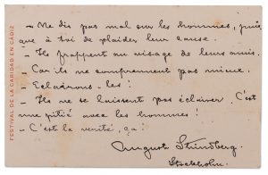 STRINDBERG AUGUSTE (1849-1921). Carte autographe signée. Stockholm. Texte autographe à l'encre en français signé sur carte du Festival de la Caridad en Cadiz. Dialogue théâtral.