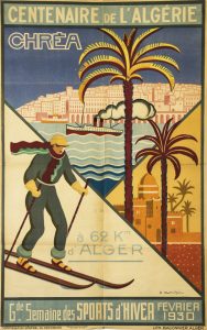 ♦ Belle affiche promotionnelle de la station de sports d’hiver de Chréa près d’Alger ; publiée à l’occasion du centenaire de la conquête de l’Algérie par les Français.