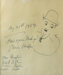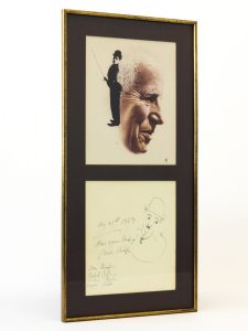 Charlie CHAPLIN - Pièce autographe signée avec dessin. S.l., 31 août 1967. Au stylo à bille. 24 x 19 cm, encadré sous verre. Autoportrait en Charlot, avec dédicace et signature autographes.