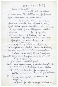 Léonard Tsuguharu FOUJITA - Lettre autographe signée « Foujita Kimiyo » adressée à Victor Berger-Vachon. Paris, 25 août 1959. 3 pp. ½ in-8, enveloppe avec adresse autographe.