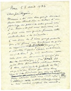 [Suit le détail des pièces empruntées à l’édition de Jean Royère] … J’espère que ce que je vais faire vous sera agréable. Je m’efforcerai d’être à la hauteur de la grande affection qui vous liait. Je revois encore l’affectueuse anxiété qui l’agitait lorsqu’il attendait votre visite à la villa qu’il occupait dans le quartier des Caroubiers à St Tropez. C’est là que je vous rencontrai pour la première fois. Quel vieux souvenir pourtant si près, cependant de 1907, 40 années !