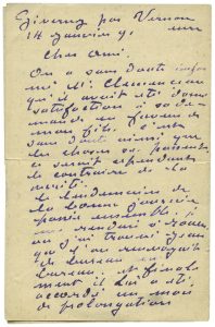 Claude MONET - Lettre autographe signée adressée à Gustave Geffroy. « Giverny par Vernon, 14 janvier 1891 ». 3 pp. in-8 à l’encre violette, enveloppe avec adresse autographe.