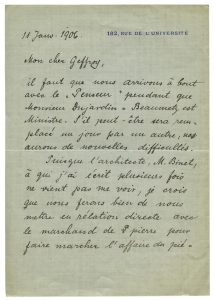 « Il faut que nous arrivions à bout avec le Penseur pendant que Monsieur Dujardin-Beaumetz est Ministre. S’il peut-être sera remplacé un jour par un autre, nous aurons de nouvelles difficultés. Puisque l’architecte, M. Binet, à qui j’ai écrit plusieurs fois ne vient pas me voir, je crois que nous ferons bien de nous mettre en relation directe avec le marchand de pierre pour faire marcher l’affaire du piédestal…».