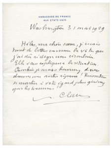 Paul CLAUDEL - Lettre autographe signée. Washington, le 31 mai 1929. 1 page. in-8, en-tête imprimé de l’Ambassade de France aux Etats-Unis.