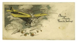10,8 x 5,7 cm, carte de vœux illustrée d’un aviateur jetant des bouquets de fleurs depuis son avion.