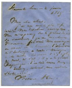 Victor HUGO - Lettre autographe signée adressée à « Mon cher Colonel » [le Colonel Lewis Peyton]. « Hauteville House – 2 janvier 1869 » [1870, cachet]. 1 page in-4, enveloppe avec adresse.