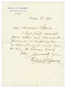 Rudyard KIPLING - Lettre autographe signée. Alger, 8 mars 1921. 1 page in-8, à l’en-tête de l’Hôtel St George.