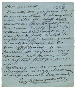 Guy de MAUPASSANT - Lettre autographe signée à l’imprimeur et éditeur Georges Chamerot, [Paris, 29 mars 1890, cachet]. 1 page in-12, format télégramme, adresse au verso.