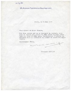 François MAURIAC - Trois lettres signées à Michel de Saint-Pierre. Paris, 1959-1965. 3 pp. in-8 et in-4, en-tête imprimé à son adresse, une enveloppe.