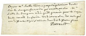 Charles PERRAULT - Note autographe signée « Perrault ». S.l.n.d. 1 page in-12 oblong étroit.