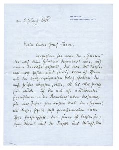 "...vorgestern hat man den "Garten" der noch beim Gärtner deponiert war, auf meine Terrasse gestellt, das war das letzte, was noch fehlte, und somit kann ich Ihnen nun den besitzanzeigenden Brief schreiben, der nicht früher abgehen sollte, als bis alles fertig sein würde. Ich bin nun also ausübender Eigenthümer in der Ramberg'schen Whonung, seit vier Jahren zum ersten Mal im "Eigenen", und dieser Erfolg steht gewissermaßen unter Ihrer Patenschaft, denn jener Ihr letzter hiesiger Abend und der Impuls und Wunsch, den Sie mir zu dieser Wohnung hinterlassen haben, waren entscheidend. Schade nur, daß Sie sich nun nicht selbst von meinem Anfang überzeugen können. Daß er unter dem Zeichen guten Willens steht, darf ich versichern, nichts desto weniger ist es sehr schwer. Wie soll man eine eigene neue Seite beginnen, wenn doch auf jeder, die man aufschlägt, die vorgeschriebenen Zeilen des Krieges stehen une seine Wasser-und Blutzeichen ?