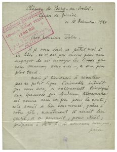 Mais je tiendrais à réveiller par ce petit signe l’aimable intérêt que vous avez si activement témoigné aux épreuves que Madame Klossowska est venue vous confier pour la vente; cela avait si bien commencé, grâce à votre zèle, maintenant il serait bien gentil, si on pouvait, pour Noël, préparer à Mme K. de nouveau une surprise agréable ! Ne voyez-vous pas le moyen, d’aviver un peu l’intérêt de quelque amateur pour les estampes qui restent à vendre ?