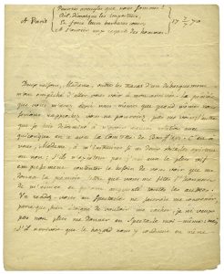 « Deux raisons, Madame, outre les tracas d’un débarquement, m’ont empêché d’aller vous voir à mon arrivée. La première que vous m’avez écrit vous-même que quand même nous serions rapprochés vous ne pourriez pas me voir, l’autre que je suis déterminé à n’avoir aucune relation avec quiconque en a avec la Comtesse de Boufflers. C’est à vous, Madame, à m’instruire si ces deux obstacles existent ou non ; s’ils n’existent pas j’irai avec le plus vif empressement contenter le besoin de vous voir que me donna la première lettre que vous me fîtes l’honneur de m’écrire et qu’ont augmenté toutes les autres. Un rendez-vous au spectacle ne saurait me convenir, parce que, bien éloigné de vouloir me cacher, je ne veux pas non plus me donner en spectacle moi-même : mais s’il arrivois que le hazard nous y conduisit en même jours, et que je le susse, ne doutez pas que je ne profitasse avec transport du plaisir de vous y voir et même que je ne me présentasse à votre loge si j ‘étois sur que cela ne vous déplut pas. Je suis affligé d’apprendre votre prochain départ. Est-ce pour augmenter mon regret que vous me proposez de vous suivre en nivernois ?