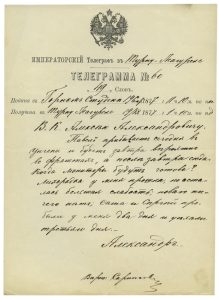 - 11 mai 1877 (de Russie à New York) : « Amiral Boutakov reçoit ordre revenir immédiatement avec toute l’escadre à Cronstadt ainsi si Dieu permet au revoir dans quelques semaines Serge a prêté serment ce matin partira bientôt ainsi que Wladimir pour le Danube rien de grave encore des théâtres de la guerre hier grande parade ici brillant au possible par temps superbe.