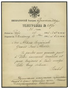 ISABELLE II, Reine d’Espagne. Télégramme adressé au Grand-duc Alexis Alexandrovitch. Paris, 24 mars 1881. Télégramme adressé suite à l’assassinat de son père, le Tsar Alexandre II, le 13 mars.