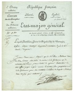 Victor Léopold BERTHIER, Général, frère et aide de camp du Maréchal Berthier. Lettre signée « au citoyen Vantage, rapporteur substitut près le 2e conseil de guerre ». Paris, 14 germinal An II (3 avril 1794). 1 page in-4, adresse.