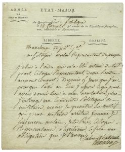 « J’obéis à l’ordre qui m’a été intimé de ta part…de me rendre au Pont couvert. Depuis 15 jours que j’ai passé au lit j’ignore ce qui peut avoir donné lieu à mon arrestation, plus j’interroge ma conduite politique et militaire moins je pénètre le motif qui peut me faire arrêter.