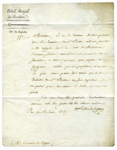 François-Henri de Franquetot, duc de COIGNY, Maréchal de France. Lettre autographe signée comme gouverneur de l’Hôtel Royal des Invalides. Paris, 26 juillet 1816. 1 page in-4, adresse au verso. Paraphe valant franchise postale.