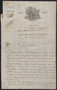 Claude Etienne GUYOT, Général de la Révolution et d’Empire. Lettre autographe signée au Ministre de la Guerre [Alexandre Berthier]. Colmar, 28 vendémiaire An X [20 octobre 1801]. 1 page ½ in-folio, belle vignette, une déchirure ...