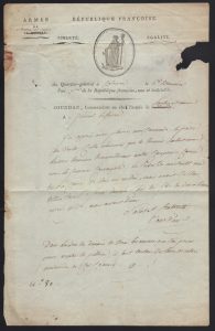 Jean-Baptiste JOURDAN, Maréchal d’Empire - Lettre autographe signée au Général Lefèvre. Cologne, 6 brumaire An III [27 octobre 1794]. 1 page in-folio, vignette en médaillon, adresse, fragments de cachet de cire rouge, déchirure due à...