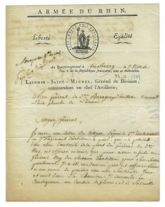 Jean-Pierre LACOMBE-SAINT-MICHEL, Général de la Révolution et d’Empire. Lettre signée au Général Baraguey d’Hilliers. Strasbourg, 7 nivôse An VIII [28 décembre 1799]. 1 page ½ in-4, vignette en médaillon, adresse.