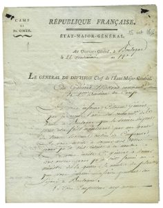 « Je vous informe, Citoyen Général que je reçois l’avis du commadt de l’armée à Boulogne, que le service du port peut être fait maintenant par une garde de trente hommes au lieu de cinquante… »