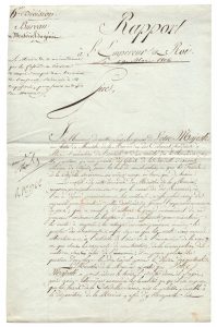 NAPOLÉON 1er - Apostille « accordé – Napole » et signature autographes en marge d’un Rapport à l’Empereur et Roi signé par son Ministre de l’Administration de la Guerre Jean-François-Aimé Dejean (1749-1824). S.l., 19 mars 1806....