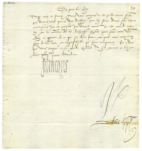 FRANÇOIS 1er, Roi de France - Trois lettres signées « Francoys » adressées à Jean de Selve, Président du Parlement de Paris, contresignées par Florimond Robertet (2) et Jean Breton (1). Saint-Germain-en-Laye, 17 au 19 avril [1523]. 2 pp....
