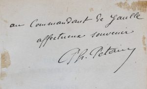 Cet envoi de Pétain à De Gaulle est à notre connaissance une pièce unique.