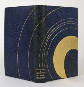 Gabriele d' ANNUNZIO - Le Martyre de Saint Sébastien. Paris, Calmann-Lévy, 1911. In-16, reliure plein maroquin bleu nuit, dos lisse, décor composé d’un visage d’ange en relief mosaïqué de noir, au coin du plat supérieur, bordé d’une...