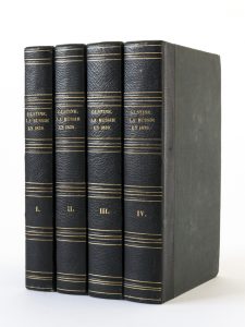 Astolphe de CUSTINE - La Russie en 1839. Paris, Librairie d’Amyot, 1843. 4 volumes in-8, reliure d’époque demi-chagrin bleu nuit, dos lisse, auteur, titre, tomaison et filets dorés (qq. rousseurs).
