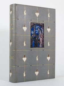 mosaïqués, plaque émaillée encastrée au centre du plat supérieur, gardes et doublure de satin moiré gris, tranches dorées sur témoins, chemise et étui bordés de maroquin bleu nuit [Creuzevault].