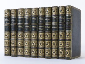 Alfred de MUSSET - Œuvres. Paris, Charpentier, 1867. 10 volumes in-32 (env. 13,5 x 8,5 cm), reliure plein maroquin bleu nuit, dos à nerfs, caissons richement ornés, plats encadrés d’un triple filet doré, filets sur les coupes, tranches...