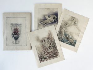 Petit in-4, en feuilles sous couverture rempliée, et chemise à rabats d’origine, vignette de titre sur le premier carton de la chemise, imprimé comme tout l’ouvrage à l’aide du procédé dit « gypsographie ».