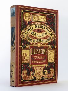Jules VERNE - Cinq semaines en ballon et Voyage au centre de la terre. Illustrations par MM. Riou et de Montaut. Paris, Collection Hetzel, sans date [vers 1910]. Grand in-8 ; cartonnage polychrome à un éléphant avec titre dans l'éventail,...