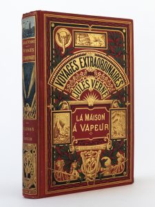 Jules VERNE - La Maison à vapeur. Voyage à travers l'Inde septentrionale. Dessins par Bennett. Paris, Collection Hetzel, sans date [vers 1910]. Grand in-8 ; cartonnage polychrome à un éléphant avec "Voyages extraordinaires" dans l'éventail,...