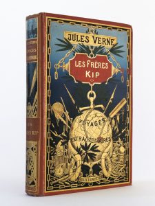 Jules VERNE - Les Frères Kip. Illustrations par George Roux, 12 grandes chromotypographies, nombreuses vues photographiques, deux cartes. Paris, Collection hetzel, sans date [1902]. Grand in-8 ; cartonnage polychrome au globe doré ou "à la...