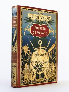 Jules VERNE - Bourses de voyage. Quarante-sept illustrations par L. Benett, 12 grandes chromotypographies, nombreuses vues photographiques, une carte. Paris, Collection Hetzel, sans date [1904]. Grand in-8 ; cartonnage polychrome au globe doré ou...