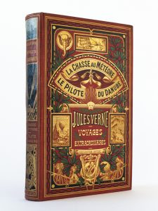 Jules VERNE - La Chasse au météore. Le Pilote du Danube. Illustrations par George Roux, planches en chromotypographie. Paris, Collection Hetzel, sans date [vers 1910]. Grand in-8 ; cartonnage polychrome à un éléphant avec titre dans...
