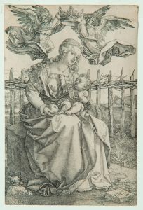 Albrecht DÜRER (1471-1528). La Vierge à l’Enfant couronnée par deux anges. Burin.