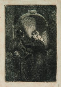 REMBRANDT VAN RIJN (1606-1669). La Maîtresse d’école à la porte de sa maison. Eau-forte.
