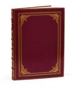Maroquin rouge, filets dorés en encadrement sur les plats, fleuron doré aux petits fers aux angles, dos à nerfs orné, encadrement de maroquin rouge à l'intérieur, orné de filets, d'une roulette et de motifs dorés, doublures et gardes de soie moirée bronze, tranches dorées (Riviere & son).