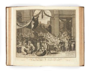 Cette monumentale publication est illustrée de 2 titres-frontispices, 3 vignettes de titre, 2 épîtres gravées, de nombreux bandeaux, lettrines et culs-de-lampe, et 212 magnifiques planches, dont 29 sur doublepage, le tout gravé sur cuivre d'après les compositions de Gérard Hoet, Arnould Houbraken, Bernard Picart, van Leiden, Bourdon, Carrache, Champagne, Le Brun, Carlo Maratta et Raphaël.