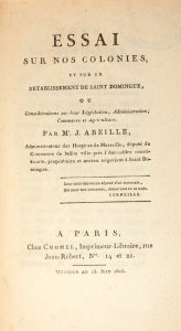 ABEILLE (Jean) - Essai sur nos colonies, et sur le rétablissement de Saint-Domingue, ou Considérations sur leur Législation, Administration, Commerce et Agriculture. Paris : Chomel, Messidor an 13. Juin 1805. — In-8, 205 x 128 : (2 ff.), XIII,...