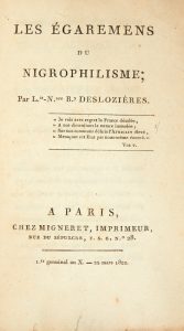 BAUDRY DES LOZIÈRES (Louis-Narcisse) - Les Égaremens du nigrophilisme. Paris : Migneret, 1er germinal an X. - 22 mars 1802. — In-8, 203 x 130 : xvj, 323 pp., couverture muette. Broché, couverture postérieure.