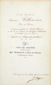 ► Précieux exemplaire offert à Abel-François Villemain (1791-1870), membre de l'Académie française, écrivain et à l'époque ministre de l'instruction publique. Il comporte une dédicace de la main de D'Avezac, de la part de la Société africaine de Londres sur un feuillet indiquant la mention imprimée : «Offert par la société instituée à Londres Pour l'Extinction de la traite des Esclaves et la Civilisation de l'Afrique.»