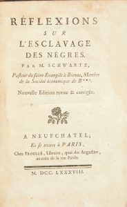 CONDORCET (Jean-Antoine-Nicolas de Caritat, Marquis de) - Réflexions sur l'esclavage des Nègres. Par M. Schwartz. Neufchatel, Paris : Froullé, 1788. — In-8, 193 x 126 : iv, viij, 86 pp., (1 f. blanc).