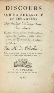 LAFFON DE LADEBAT (André-Daniel) - Discours sur la nécessité et les moyens De détruire l'esclavage dans les colonies. Bordeaux : imprimerie de Michel Racle, 1788. — In-8, 220 x 134 : 43 pp., couverture muette. Broché.