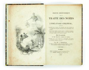 MORENAS (Joseph) - Précis historique de la Traite des Noirs et de l'esclavage colonial. Paris : chez l'auteur, Firmin Didot, 1828. — In-8, 207 x 131 : frontispice, (2 ff.), VIII, 423 pp., 3 portraits, couverture imprimée.