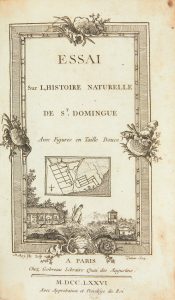 [NICOLSON (Bartholomaeus)] - Essai sur l'histoire naturelle de l'isle de Saint-Domingue. Paris : Gobreau, 1776. — In-8, 191 x 119 : titre-frontispice, xxxj, 374 pp., (1 f.), 10 planches.